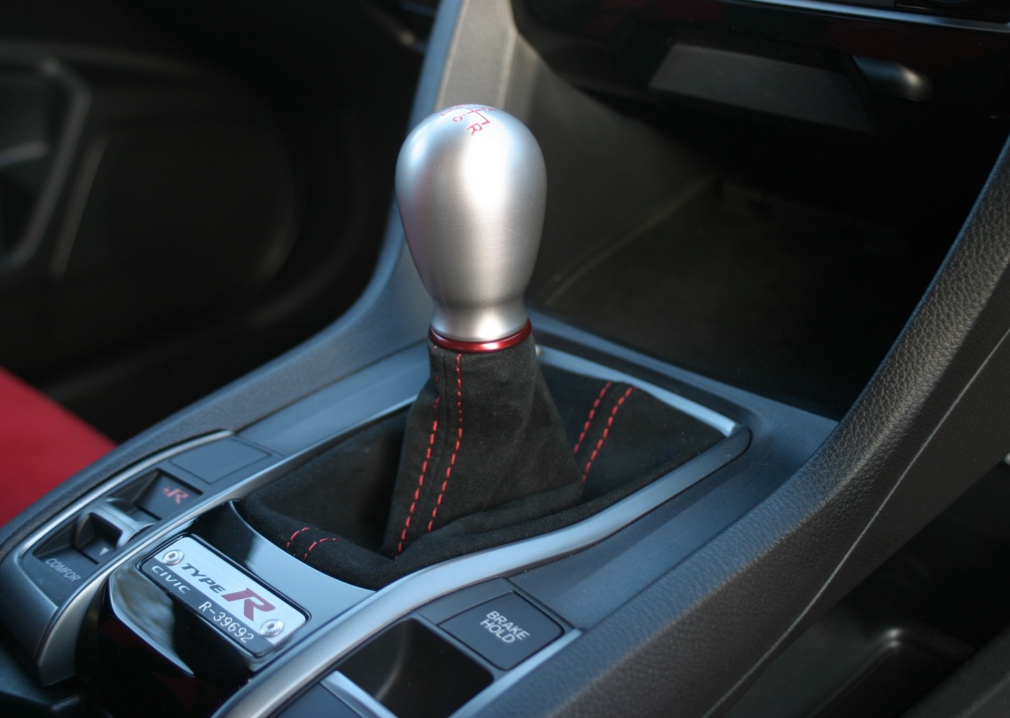 The Type R sports bucket seats hug your waist nicely and the red suede style fabric grips you into place. Both front seats only have manual adjustment for recline and forward/back, with the driver getting additional manual height adjustment. The rest of the interior follows a similar race-inspired look with black suede style door trim with red stitching and a carbon fibre look across the dash. To demonstrate the special nature of the Type R you get a serial number plate near the gear shift lever.
