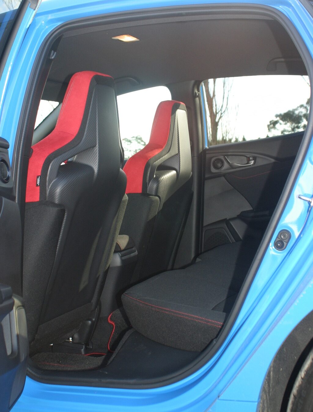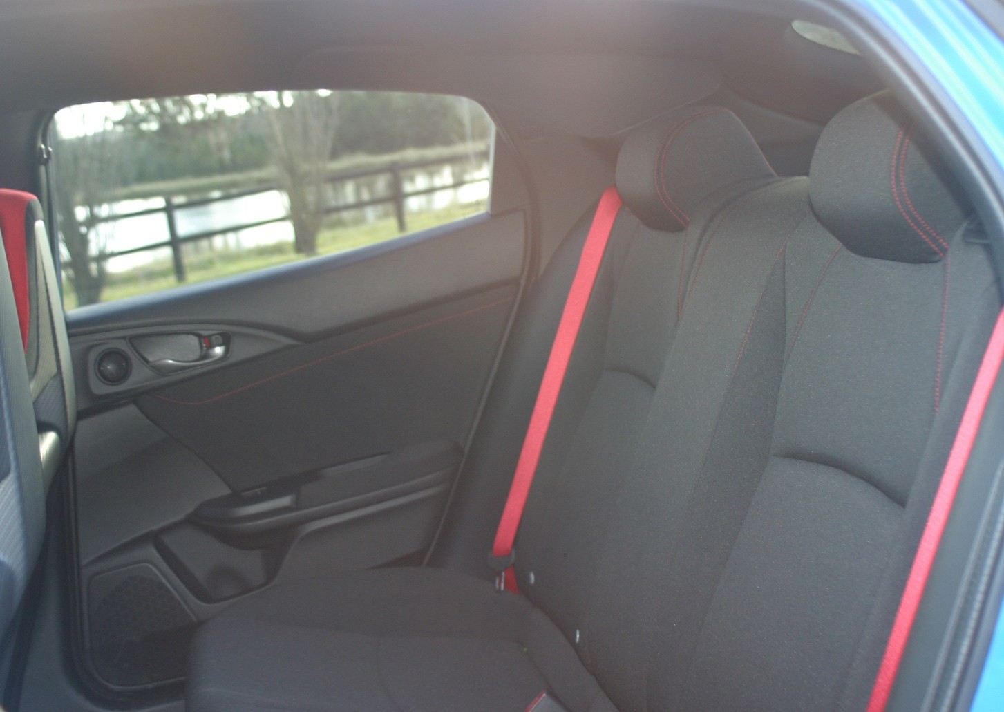 The rear seats are covered with black fabric with red stitching and there are only two of them, which isn’t a big deal in my opinion as the width of the Type R would mean that three people would not fit across the back seat anyway. There is enough head and leg room for two adults to sit in the rear seats and for children there are two ISOFIX/three rear tether child seat restraint points.